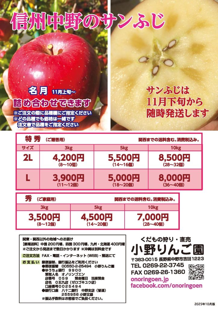 | 注文方法 | FAX 0269-26-1360 WEB申込み onoringoen.jp/order_apple メール申込み info.onoringoen@gmail.com Facebookメッセージ facebook.com/onoringoen.bypass |
